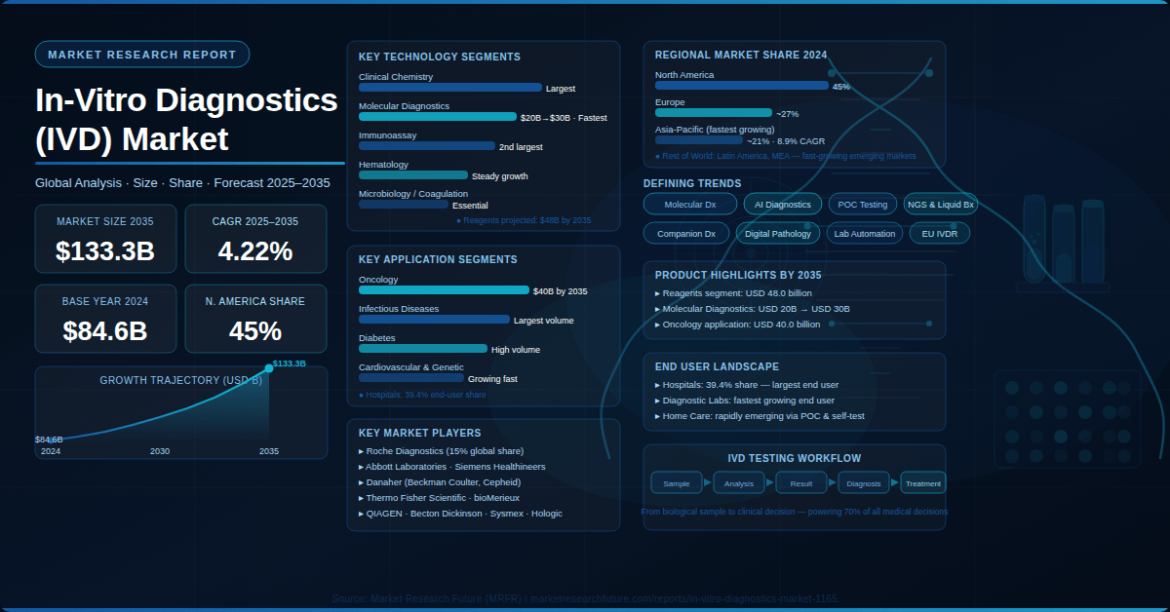 Pune, India — The global In-Vitro Diagnostics (IVD) Market is on a sustained and strategically significant growth path, according to the latest In-Vitro Diagnostics Market report published by Market Research Future (MRFR). Valued at USD 84.6 billion in 2024, the market is projected to grow from USD 88.17 billion in 2025 to USD 133.3 billion by 2035, representing a compound annual growth rate (CAGR) of 4.22% during the forecast period 2025 to 2035. As one of the most foundational segments of the global healthcare system — enabling diagnosis, monitoring, and treatment guidance for billions of patients worldwide — the IVD market occupies a unique and irreplaceable position at the crossroads of clinical medicine, biotechnology, and digital health. This trajectory closely mirrors the Longevity Market size expansion globally, where aging demographics and the imperative for preventive, early-detection healthcare are simultaneously driving demand for advanced diagnostic solutions across all patient population segments.